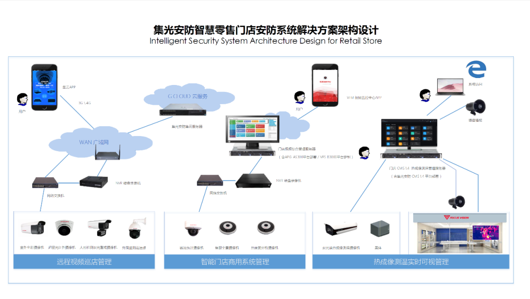 永乐高ylg888888安防双光智能警戒系统 支持门店部署,摄像机部署于门店出入口, 除可满足门店视频监控功能外,当顾客进店时,该系统可第一时间通过前沿人形检测视频分析技术识别顾客进店状态,按后台预设欢迎语播报欢迎语音进行提醒,便于店员及时提供接待服务,提升门店新老顾客进店的体验及满意度,系统支持永乐高ylg888888安防G-Cloud集云移动客户端远程视频管理、报警邮件推送。