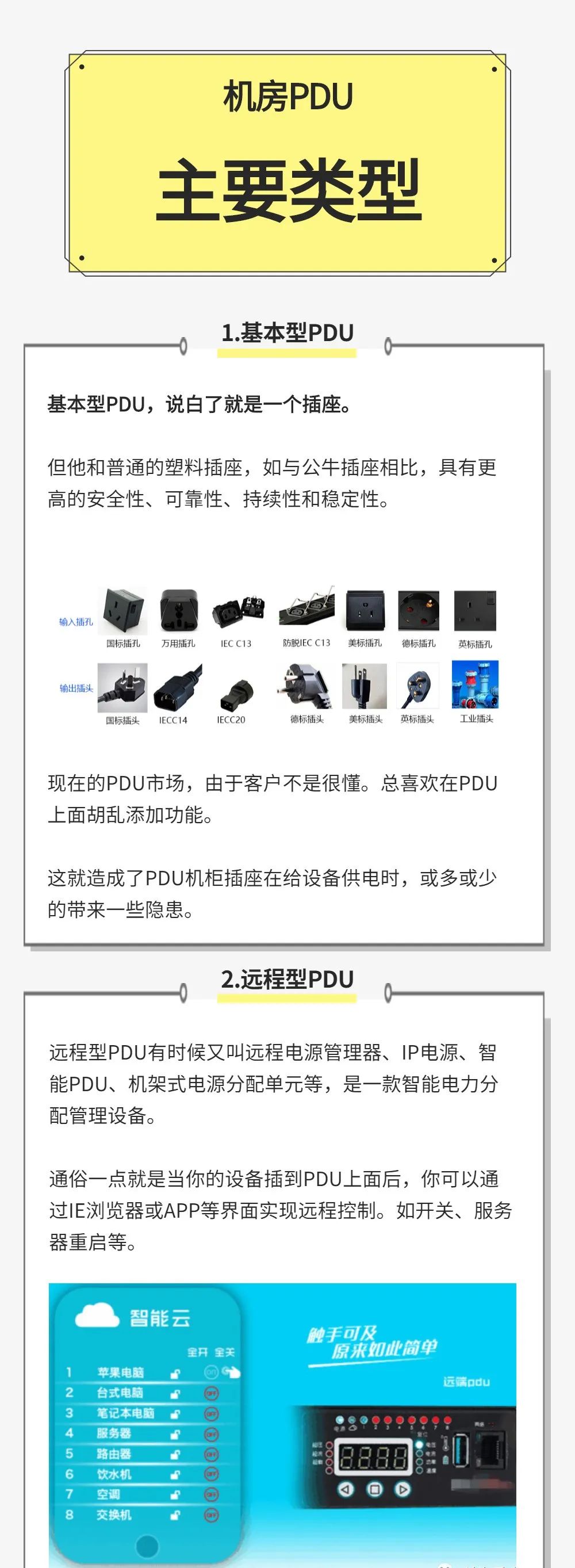 要了解PDU如何选购,先要知道PDU如何分类。目前市面上的PDU可以分为两类:基本型PDU 、远程型PDU,以下是它们的相关介绍: