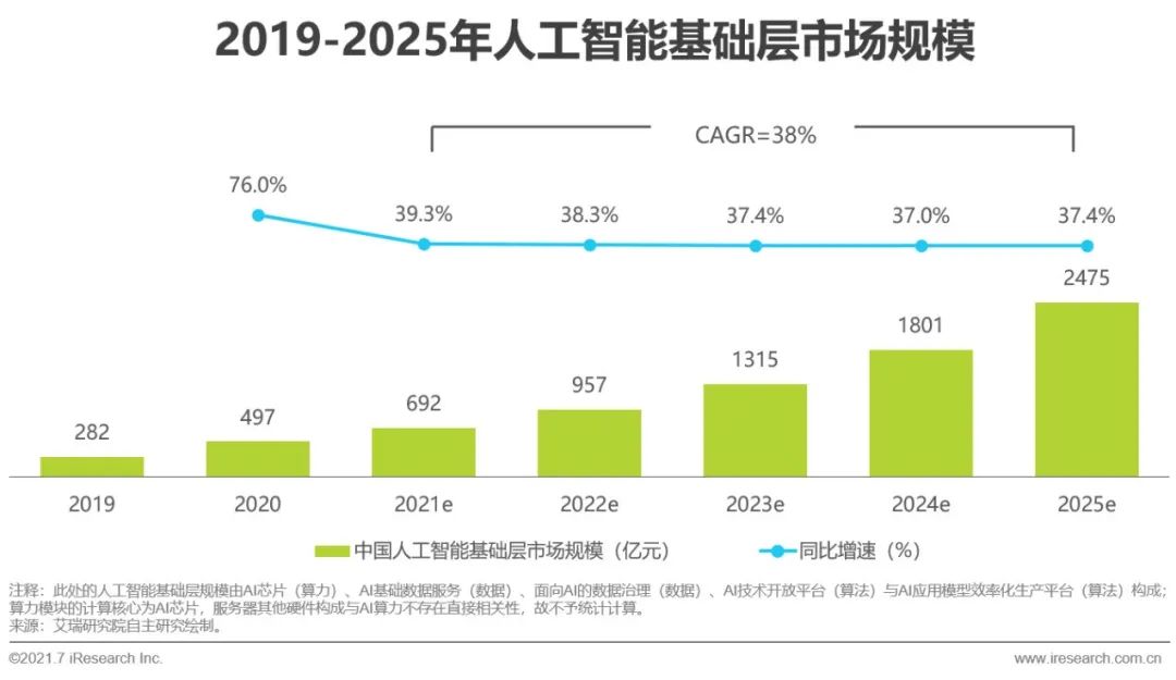 AI企业突破业务增长瓶颈的需求是人工智能基础层发展的驱动力之一。当前人工智能核心产业规模保持线性增长态势,且增速趋于平稳与常态化。为寻求产值增长突破点,AI企业发力探索开拓市场的有效手段。依托人工智能基础层资源建设,AI企业可有效应对下游客户的长尾应用需求,再将高频应用转化为新主营业务。此外“新基建”、半导体自主可控等相关政策扶持、传统行业智能化转型等因素也都在助推人工智能基础层资源的发展。据艾瑞测算,2021-2025年,人工智能基础层市场规模CAGR为38%,整体产业规模发展速度较快、空间较为广阔,总体呈现持续增长的走势。2020年,中国人工智能基础层市场规模为497亿元,为人工智能产业总规模的33%,市场规模相较去年同比增长76%,AI应用模型效率化生产平台创收增长、AI芯片市场规模随着云端训练需求出现较高增长等是同比增速的主要拉动力;2021-2024年同比增速趋于平缓下降,市场开始恢复稳步增长态势。到2025年,中国人工智能基础层市场规模将达到2475亿元,云端推理与端侧推理芯片市场持续走高使得人工智能基础层整体市场同比增速稍有抬升。