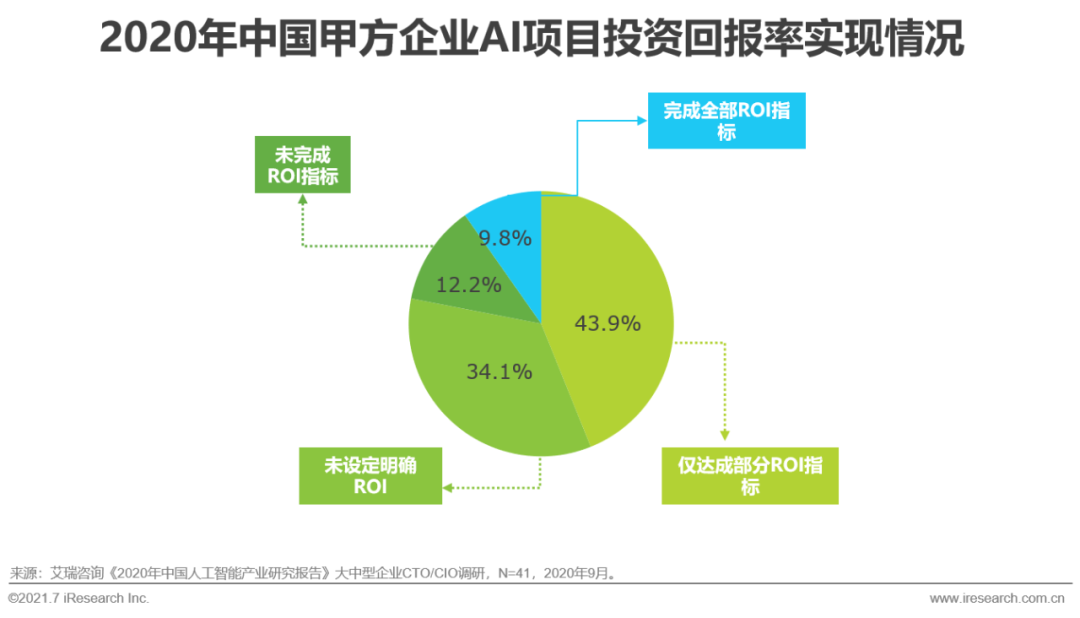 根据艾瑞2020年执行的CTO调研,2019年超过51%的样本企业AI相关研发费用占总研发费用比重在10%以上,2020年65.9%的企业AI研发占比达到10%以上。一方面是甲方企业不断增长的对智能化转型的强劲需求,一方面则是在AI应用开发与部署过程中企业普遍面临的数据质量(49%)、技术人才(51%)等基础资源配置难点。且目前只有少数企业可以完成AI项目实施前设定的全部投资回报率(ROI)标准,因此甲方企业在投资AI项目时相对审慎。AI基础层资源则可有效缓解甲方利用AI技术重塑自身业务时的投资矛盾,提升模型生产效率,降低部署成本:数据资源集群具备数据采标与数据治理能力,且一站式的数据平台可对实时数据进行统一管理,提高数据利用率;高效的AI算力集群与调度系统可满足模型训练与推理需求,降低总拥有成本(TCO,TotalCost of Ownership);基于算法开发平台演化出的语音识别、计算机视觉、机器学习等专业的AI模型生产平台,可提供高效、一站式的AI模型生产服务。