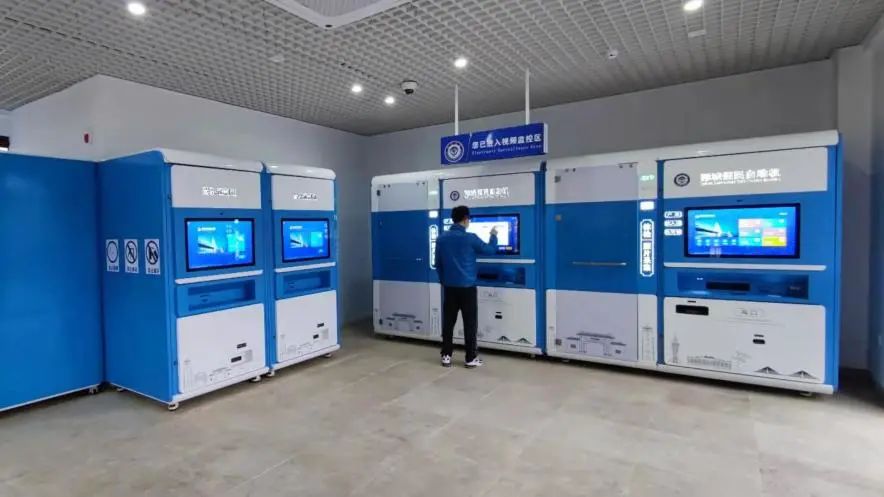 蓝白色的自助一体机整齐排列,科技感十足